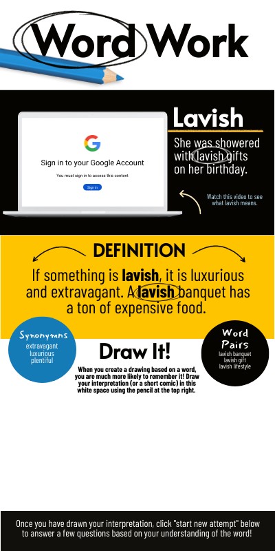 Once you have drawn your interpretation, click "start new attempt" below to answer a few questions based on your understanding of the word!