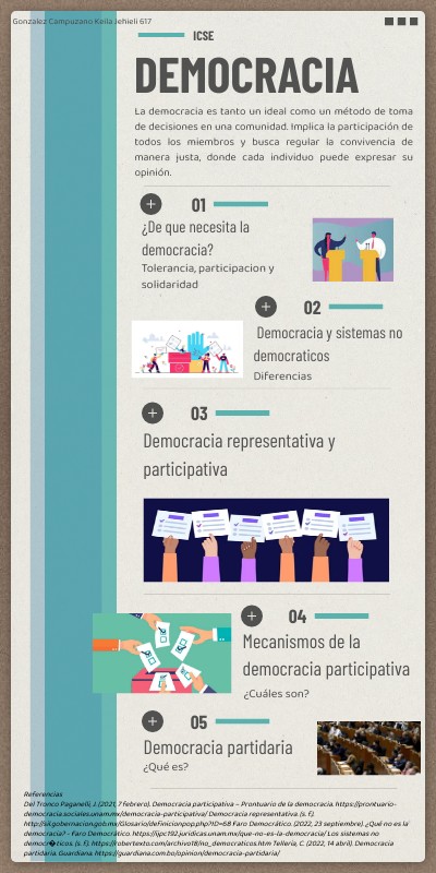 Referencias Del Tronco Paganelli, J. (2021, 7 febrero). Democracia participativa – Prontuario de la democracia. https://prontuario-democracia.sociales.unam.mx/democracia-participativa/ Democracia representativa. (s. f.). http://sil.gobernacion.gob.mx/Glosario/definicionpop.php?ID=68 Faro Democrático. (2022, 23 septiembre). ¿Qué no es la democracia? - Faro Democrático. https://ijpc192.juridicas.unam.mx/que-no-es-la-democracia/ Los sistemas no democr�ticos. (s. f.). https://robertexto.com/archivo18/no_democraticos.htm Telleria, C. (2022, 14 abril). Democracia partidaria. Guardiana. https://guardiana.com.bo/opinion/democracia-partidaria/