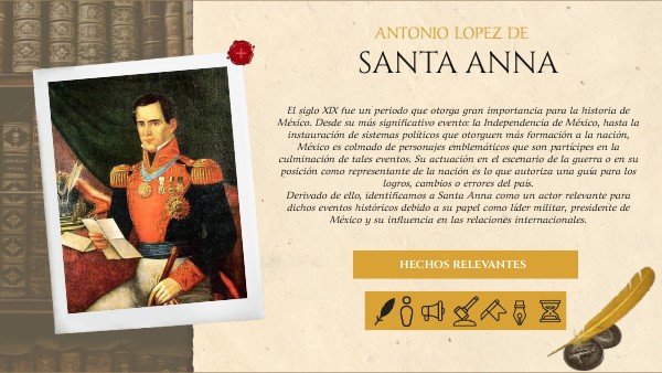 El siglo XIX fue un periodo que otorga gran importancia para la historia de México. Desde su más significativo evento: la Independencia de México, hasta la instauración de sistemas políticos que otorguen más formación a la nación, México es colmado de personajes emblemáticos que son partícipes en la culminación de tales eventos. Su actuación en el escenario de la guerra o en su posición como representante de la nación es lo que autoriza una guía para los logros, cambios o errores del país. Derivado de ello, identificamos a Santa Anna como un actor relevante para dichos eventos históricos debido a su papel como líder militar, presidente de México y su influencia en las relaciones internacionales.
