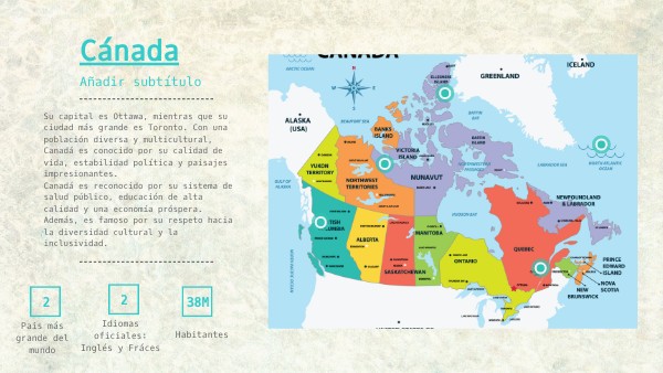 Su capital es Ottawa, mientras que su ciudad más grande es Toronto. Con una población diversa y multicultural, Canadá es conocido por su calidad de vida, estabilidad política y paisajes impresionantes.Canadá es reconocido por su sistema de salud público, educación de alta calidad y una economía próspera. Además, es famoso por su respeto hacia la diversidad cultural y la inclusividad.