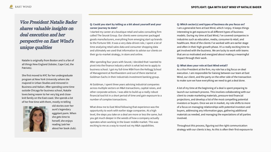 particularly for sponsors who have been relatively quiet over the last year. We know they are sitting on near record levels of dry powder and are eager to put that capital to work. Q: What do you think sets East Wind apart from other firms? The team at East Wind works seamlessly together – it is a collaborative and supportive environment. We take pride in the fact that we are not siloed, we are able to leverage expertise and relationships across the firm in any given transaction, allowing us to get to the most positive outcome possible for our clients. We also work collaboratively with our clients to custom build a process that allows them to efficiently achieve their desired outcome. We are not bound to any cookie-cutter processes and are able to address any nuances that may arise as part of the transaction. Every deal presents its unique challenges, and our team has expertise in acting nimbly and quickly to find a solution. Q: What’s the most rewarding part of your job? I find it very rewarding to work directly with such exciting and innovative founders. This is an advantage of working with lower and middle market companies. I always love when we have an introductory call with a new client and get to hear the story of their company and the founder’s goals and motivations. It’s very inspiring to see the passion and determination that goes into building these businesses, and it’s meaningful to be able to play a part in achieving these goals. The transactions we work on are truly transformative for these founders, and as their advisors, it is really exciting to get to be a part of that entrepreneurial journey.