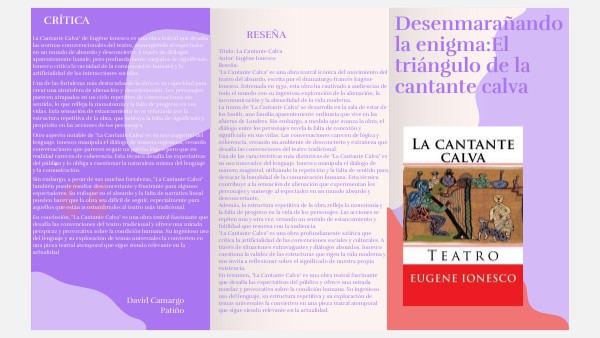 La Cantante Calva" de Eugène Ionesco es una obra teatral que desafía las normas con12vencionales del teatro, sumergiendo al espectador en un mundo de absurdo y desconcierto. A través de diálogos aparentemente banale, pero profundamente cargados de significado, Ionesco critica la vacuidad de la comunicación humana y la artificialidad de las interacciones sociales. Una de las fortalezas más destacadas de la obra es su capacidad para crear una atmósfera de alienación y desorientación. Los personajes parecen atrapados en un ciclo repetitivo de conversaciones sin sentido, lo que refleja la monotomía y la falta de progreso en sus vidas. Esta sensación de estancamiento se ve reforzada por la estructura repetitiva de la obra, que subraya la falta de significado y propósito en las acciones de los personajes. Otro aspecto notable de "La Cantante Calva" es su uso magistral del lenguaje. Ionesco manipula el diálogo de manera ingeniosa, creando conversaciones que parecen seguir un patrón lógico pero que en realidad carecen de coherencia. Esta técnica desafía las expectativas del público y lo obliga a cuestionar la naturaleza misma del lenguaje y la comunicación. Sin embargo, a pesar de sus muchas fortalezas, "La Cantante Calva" también puede resultar desconcertante y frustrante para algunos espectadores. Su enfoque en el absurdo y la falta de narrativa lineal pueden hacer que la obra sea difícil de seguir, especialmente para aquellos que están acostumbrados al teatro más tradicional. En conclusión, "La Cantante Calva" es una obra teatral fascinante que desafía las convenciones del teatro tradicional y ofrece una mirada perspicaz y provocativa sobre la condición humana. Su ingenioso uso del lenguaje y su exploración de temas universales la convierten en una pieza teatral atemporal que sigue siendo relevante en la actualidad