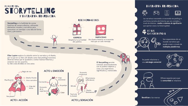 Ellen Lupton explora la relación entre la narrativa y el diseño, por lo que en su libro (El diseño como Storytelling) menciona diversos temas que te ayudarán a contar buenas historias y conectar con los usuarios. Su libro está dividido en tres actos: