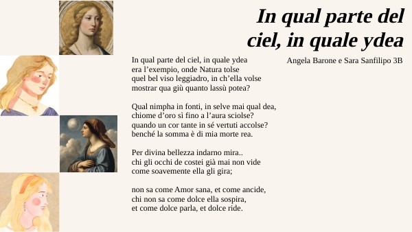 In qual parte del ciel, in quale ydea era l’exempio, onde Natura tolse quel bel viso leggiadro, in ch’ella volse mostrar qua giù quanto lassù potea? Qual nimpha in fonti, in selve mai qual dea, chiome d’oro sì fino a l’aura sciolse? quando un cor tante in sé vertuti accolse? benché la somma è di mia morte rea. Per divina bellezza indarno mira.. chi gli occhi de costei già mai non vide come soavemente ella gli gira; non sa come Amor sana, et come ancide, chi non sa come dolce ella sospira, et come dolce parla, et dolce ride.