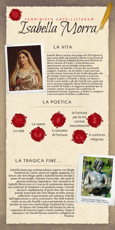 Isabella Morra nacque non prima del 1515 (ignota la data esatta della sua nascita) a Favale in provincia di Matera, (l’odierna Valsinni) da Giovanni Michele di Morra, barone di Favale, e Luisa Brancaccio, appartenente ad una famiglia aristocratica napoletana. Ad Isabella e ad uno dei suoi fratelli maggiori, Scipione, sin da subito è stata riservata un’educazione letteraria di alto livello dal padre che gli trasmise l’amore per la letteratura e la poesia. Emigrati il padre e il fratello a Roma, lei rimase a Favale con la madre e gli altri fratelli con i quali non aveva un buon rapporto. Quest’ultimi la rinchiusero nel castello di Favale e le negarono qualsiasi tipo di contatto umano. In questa sua condizione di isolamento forzato, la giovane, si dedicò a comporre i suoi versi pieni di dolore e sofferenza.