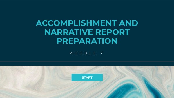 After the completion of the module, the students will be able to:1. Identify an accomplishment and narrative report. 2. Differentiate accomplishment from narrative report. 3. Create an accomplishment and narrative report based on the community project made.