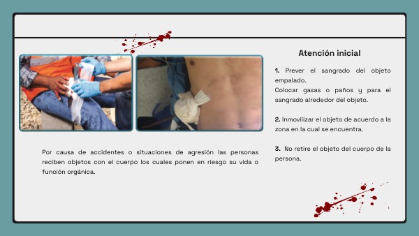 1. Prever el sangrado del objeto empalado. Colocar gasas o paños y para el sangrado alrededor del objeto. 2. Inmovilizar el objeto de acuerdo a la zona en la cual se encuentra. 3. No retire el objeto del cuerpo de la persona.