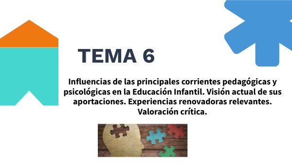 A lo largo del tema 6 trataremos las principales corrientes pedagógicas y psicológicas y su influencia en la educación, en la forma en la que el niño aprende según sus particularidades, características y necesidades.