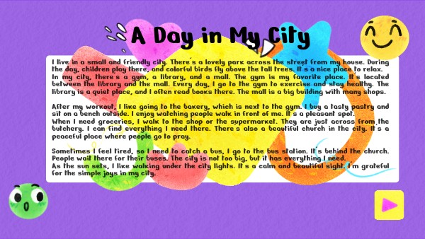 I live in a small and friendly city. There's a lovely park across the street from my house. During the day, children play there, and colorful birds fly above the tall trees. It's a nice place to relax. In my city, there's a gym, a library, and a mall. The gym is my favorite place. It's located between the library and the mall. Every day, I go to the gym to exercise and stay healthy. The library is a quiet place, and I often read books there. The mall is a big building with many shops. After my workout, I like going to the bakery, which is next to the gym. I buy a tasty pastry and sit on a bench outside. I enjoy watching people walk in front of me. It's a pleasant spot. When I need groceries, I walk to the shop or the supermarket. They are just across from the butchery. I can find everything I need there. There's also a beautiful church in the city. It's a peaceful place where people go to pray. Sometimes I feel tired, so I need to catch a bus, I go to the bus station. It's behind the church. People wait there for their buses. The city is not too big, but it has everything I need. As the sun sets, I like walking under the city lights. It's a calm and beautiful sight. I'm grateful for the simple joys in my city.