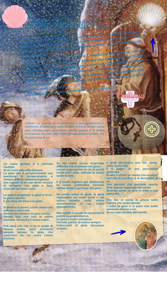 "Ma quale è la vera letizia?". "Ecco, io torno da Perugia e, a notte profonda, giungo qui, ed è un inverno fangoso e così rigido che, alI'estremità della tonaca, si formano dei ghiacciuoli d'acqua congelata, che mi percuotono continuamente le gambe fino a far uscire il sangue da siffatte ferite. E io tutto nel fango, nel freddo e nel ghiaccio, giungo alla porta e, dopo aver a lungo picchiato e chiamato, viene un frate e chiede: "Chi è?" Io rispondo: "Frate Francesco". E quegli dice: "Vattene, non è ora decente questa, di andare in giro, non entrerai". E poiché io insisto ancora, I'altro risponde: "Vattene, tu sei un semplice ed un idiota, qui non ci puoi venire ormai; noi siamo tanti e tali che non abbiamo bisogno di te". E io sempre resto davanti alla porta e dico: "Per amor di Dio, accoglietemi per questa notte". E quegli risponde: "Non lo farò. Vattene al luogo dei Crociferi e chiedi là". Ebbene, se io avrò avuto pazienza e non mi sarò conturbato, io ti dico che qui è la vera letizia e qui è la vera virtù e la salvezza dell'anima".