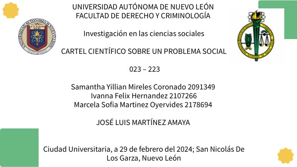 UNIVERSIDAD AUTÓNOMA DE NUEVO LEÓN FACULTAD DE DERECHO Y CRIMINOLOGÍA Investigación en las ciencias sociales CARTEL CIENTÍFICO SOBRE UN PROBLEMA SOCIAL 023 – 223 Samantha Yillian Mireles Coronado 2091349 Ivanna Felix Hernandez 2107266 Marcela Sofia Martinez Oyervides 2178694 JOSÉ LUIS MARTÍNEZ AMAYA Ciudad Universitaria, a 29 de febrero del 2024; San Nicolás De Los Garza, Nuevo León