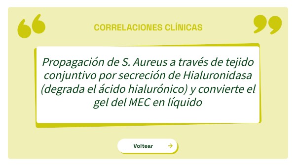 Propagación de S. Aureus a través de tejido conjuntivo por secreción de Hialuronidasa (degrada el ácido hialurónico) y convierte el gel del MEC en líquido