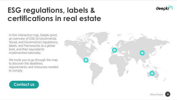 In this interactive map, Deepki provides an overview of global sustainability regulations, labels, and frameworks, along with their national equivalents. We invite you to explore the map to discover key deadlines, requirements, and resources needed for compliance.