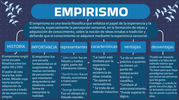 El empirismo es una teoría filosófica que enfatiza el papel de la experiencia y la evidencia, especialmente la percepción sensorial, en la formación de ideas y adquisición de conocimiento, sobre la noción de ideas innatas o tradición y defiende que el conocimiento se adquiere mediante la experiencia sensorial .
