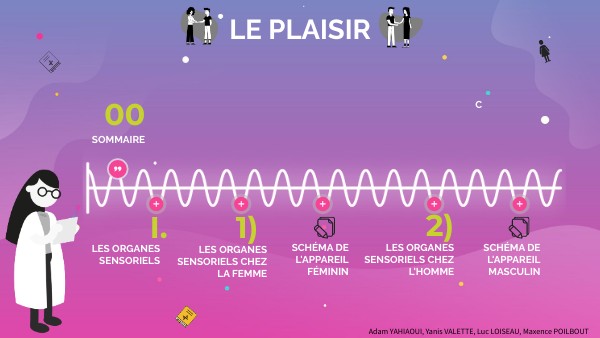 Problématique: Cest quoi le plaisir ? I. Les organes sensoriels 1) Les organes sensoriels chez la femme schéma de l'appareil reproducteur féminin 2) Les organes sensoriels chez l'homme schéma de l'appareil reproducteur masculin 3) Les points communs II. Le circuit de la récompense 1) Quelques zones du circuit de la récompense 2) Le plaisir sexuel, la resultante de plusieurs composantes.