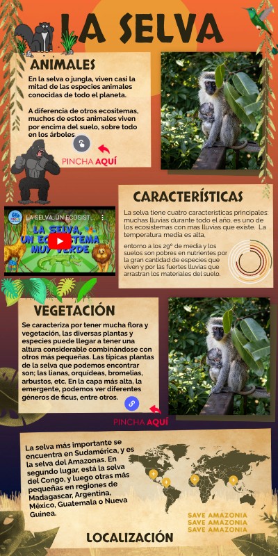 En la selva o jungla, viven casi la mitad de las especies animales conocidas de todo el planeta. A diferencia de otros ecositemas, muchos de estos animales viven por encima del suelo, sobre todo en los árboles.