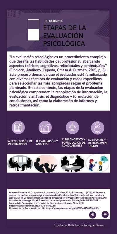 Fuentes: Elcovich, H. G., Andiloro, L., Cepeda, J., Chiesa, V. S., & Guzman, L. (2015). Guía para el proceso de evaluación psicológica: una introducción al ámbito clínico, educacional, jurídico y laboral. En VII Congreso Internacional de Investigación y Práctica Profesional en Psicología XXII Jornadas de Investigación XI Encuentro de Investigadores en Psicología del MERCOSUR. Facultad de Psicología - Universidad de Buenos Aires, Buenos Aires. URL: https://www.aacademica.org/000-015/932.pdf Pinterest. (s.f.). Recuperado de URL: https://www.pinterest.es/pin/678776975088164140/