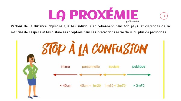 Activité interactive pour discuter en classe FLE sur les distances accepées selon une culture ou des codes comportamentaux. Une opportunité aussi pour parler du respect du corps et des femmes.