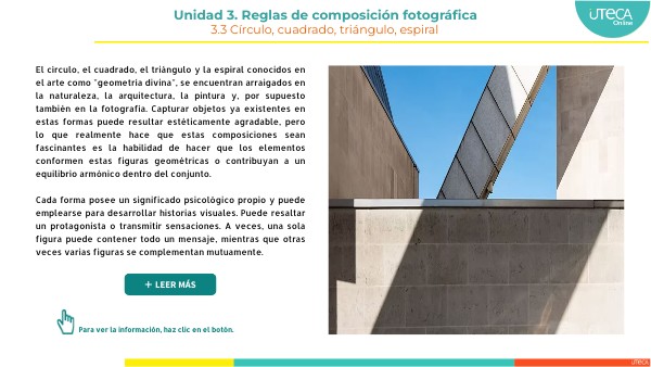 El círculo, el cuadrado, el triángulo y la espiral conocidos en el arte como "geometría divina", se encuentran arraigados en la naturaleza, la arquitectura, la pintura y, por supuesto también en la fotografía. Capturar objetos ya existentes en estas formas puede resultar estéticamente agradable, pero lo que realmente hace que estas composiciones sean fascinantes es la habilidad de hacer que los elementos conformen estas figuras geométricas o contribuyan a un equilibrio armónico dentro del conjunto. Cada forma posee un significado psicológico propio y puede emplearse para desarrollar historias visuales. Puede resaltar un protagonista o transmitir sensaciones. A veces, una sola figura puede contener todo un mensaje, mientras que otras veces varias figuras se complementan mutuamente.