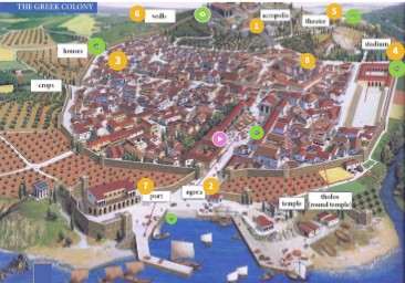 The acropolis was located on the highest ground and contained the important municipal and religious buildings. The Greek root acro- means "high;" thus, an acropolis is basically a "high city". Why do you think this area was built on high ground?