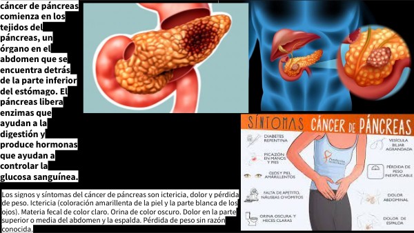 Los signos y síntomas del cáncer de páncreas son ictericia, dolor y pérdida de peso. Ictericia (coloración amarillenta de la piel y la parte blanca de los ojos). Materia fecal de color claro. Orina de color oscuro. Dolor en la parte superior o media del abdomen y la espalda. Pérdida de peso sin razón conocida.