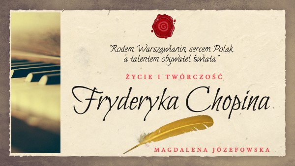 to jeden z najwybitniejszych kompozytorów świata. Czołowy przedstawiciel romantyzmu w muzyce. Był Polakiem, choć nosił francuskie nazwisko, a kiedy żył, Polski nie zaznaczano na mapach. Jego ojczyzna na 123 lata znalazła się pod panowaniem obcych państw. Mimo tak trudnych czasów Fryderyk Chopin zrobił ogromną karierę, rozsławiając tradycje swojej ojczyzny na całym świecie.Przed jego muzyką chyliły czoła najbardziej znane osobistości XIX wieku - królowie, księżniczki, arystokraci i artyści. Największe sale koncertowe pełne były ludzi marzących, by posłuchać jego gry. W bardzo młodym wieku osiągnął wielki sukces. Do dziś utwory Chopina są podziwiane i znane na całym świecie. Jak tego dokonał? Co takiego jest w jego muzyce?