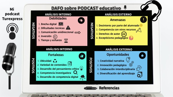 La matriz DAFO es una herramienta de análisis estratégico muy utilizada en el campo de la investigación económica y el marketing. En este caso concreto, nos va a permir realizar un análisis interno del podcast como recurso educativo, valorando los aspectos positivos (FORTALEZAS) y negativos (DEBILIDADES) y un análisis externo de las OPORTUNIDADES y AMENAZAS que supone la utilización de este tipo de herramientas en el ámbito educativo.