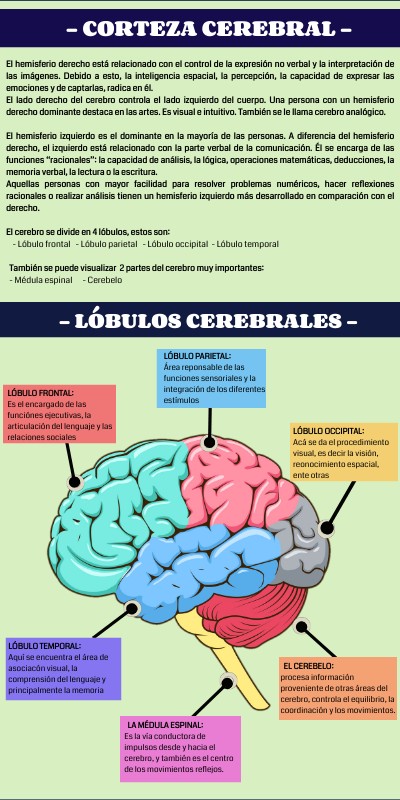 El hemisferio derecho está relacionado con el control de la expresión no verbal y la interpretación de las imágenes. Debido a esto, la inteligencia espacial, la percepción, la capacidad de expresar las emociones y de captarlas, radica en él.El lado derecho del cerebro controla el lado izquierdo del cuerpo. Una persona con un hemisferio derecho dominante destaca en las artes. Es visual e intuitivo. También se le llama cerebro analógico. El hemisferio izquierdo es el dominante en la mayoría de las personas. A diferencia del hemisferio derecho, el izquierdo está relacionado con la parte verbal de la comunicación. Él se encarga de las funciones “racionales”: la capacidad de análisis, la lógica, operaciones matemáticas, deducciones, la memoria verbal, la lectura o la escritura. Aquellas personas con mayor facilidad para resolver problemas numéricos, hacer reflexiones racionales o realizar análisis tienen un hemisferio izquierdo más desarrollado en comparación con el derecho. El cerebro se divide en 4 lóbulos, estos son: - Lóbulo frontal - Lóbulo parietal - Lóbulo occipital - Lóbulo temporal También se puede visualizar 2 partes del cerebro muy importantes: - Médula espinal - Cerebelo