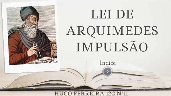 9. Como balões funcionam 8. Como submarinos funcionam 7. Como navios funcionam 6. Os três casos possíveis 5. Fatores que depende a impulsão 4. A Impulsão 3. Fenómenos explicados pela Lei de Arquimedes 2. Lei de Arquimedes- descrição 1. Quem foi Arquimedes