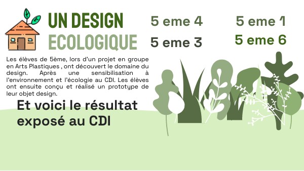 Les élèves de 5ème, lors d'un projet en groupe en Arts Plastiques , ont découvert le domaine du design. Après une sensibilisation à l'environnement et l'écologie au CDI. Les élèves ont ensuite conçu et réalisé un prototype de leur objet design.