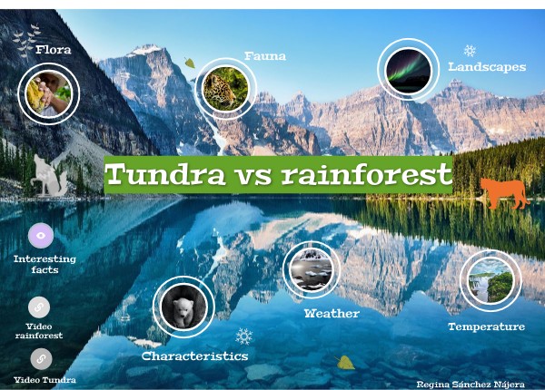 1. The tundra is located at the North Pole in Greenland, Iceland, northern Canada, northern Russia, Siberia, Norway and other northern European countries, also in high-altitude areas; and at the South Pole in Antarctica, some islands and part of Chile and Argentina. 2. The Amazon is the tropical rainforest that provides the most oxygen to the Earth by more than 20%. 3. Tundra, as well as rainforest, have been affected by climate warming in recent years. 4. The Arctic tundra is covered with permafrost, a layer of soil that has been frozen for thousands of years, however it is in danger of thawing due to rising temperatures in the area. 5. Both the rainforest and the tundra have endemic species in danger of extinction that can only be preserved if we achieve a change as humanity, from raising awareness as a population to implementing agricultural, forestable and sustainable practices to help these beautiful ecosystems that are the greatest source of natural resources on the planet.