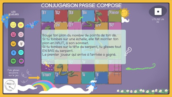 Bouge ton pion du nombre de points de ton dé. Si tu tombes sur une échelle, elle fait monter ton pion en HAUT, à son sommet. Si tu tombes sur la tête du serpent, tu glisses tout EN BAS du serpent. Le premier joueur qui arrive à l'arrivée a gagné.
