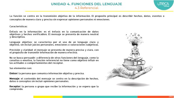 Características: Énfasis en la información: es el énfasis en la comunicación de datos objetivos y hechos verificables. El mensaje se presenta de manera neutral y descriptiva. Lenguaje objetivo: se caracteriza por el uso de un lenguaje claro y objetivo, sin incluir juicios personales, emociones o valoraciones subjetivas. Precisión y claridad: el mensaje se presenta de manera precisa y clara, con el propósito de transmitir información de manera efectiva. No se busca persuadir: a diferencia de otras funciones del lenguaje, como la conativa o emotiva, la función referencial no tiene como objetivo influir en las actitudes o comportamientos del receptor. Sus elementos son: Emisor: la persona que comunica información objetiva y precisa. Mensaje: el contenido del mensaje se centra en la descripción de hechos, datos o conceptos sin incluir opiniones personales. Receptor: la persona o grupo que recibe la información y se espera que la comprenda.