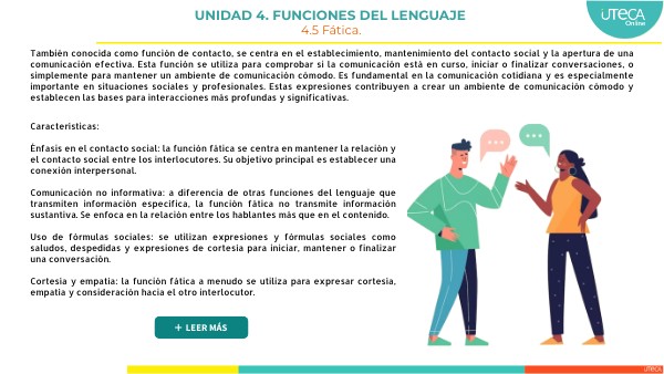 También conocida como función de contacto, se centra en el establecimiento, mantenimiento del contacto social y la apertura de una comunicación efectiva. Esta función se utiliza para comprobar si la comunicación está en curso, iniciar o finalizar conversaciones, o simplemente para mantener un ambiente de comunicación cómodo. Es fundamental en la comunicación cotidiana y es especialmente importante en situaciones sociales y profesionales. Estas expresiones contribuyen a crear un ambiente de comunicación cómodo y establecen las bases para interacciones más profundas y significativas.