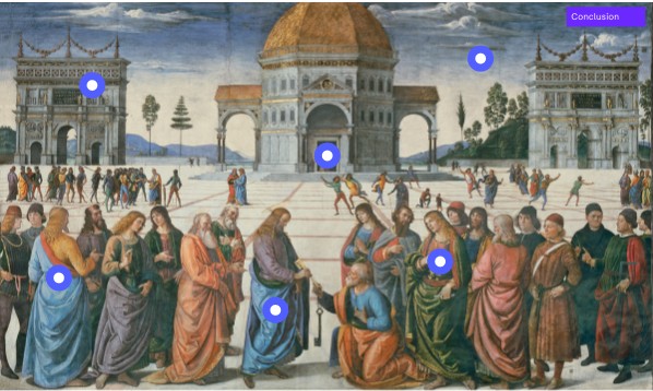 The artist used various techniques such as atmospheric perspective, linear perspective, and orthogonal and horizontal lines to create the illusion of three-dimensionality. The orange stones act as orthogonal lines that give the viewer a sense of moving forward and back in space. Because the figures are grouped in the foreground and then creating smaller figures that establish the illusion of moving back in space, the artist effectively used horizontal lines and analysis to create depth. The figures overlapping each other in the foreground also help contribute to the illusion of three-dimensionality on a flat fresco. It is also interesting to note that this button is placed exactly where the vanishing point is!