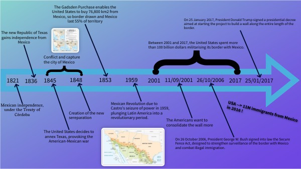 Le 11 septembre 2001 en relançant l’obsession de sécurisation du territoire américain, l’administration a multiplié les surenchères pour rendre hermétique une frontière par où transitent des migrants illégaux : 12 millions déjà sur le sol américain dont 75 % d’hispaniques. Entre 2001 et 2017, les États-Unis ont dépensé plus de 100 milliards de dollars dans la militarisation de leur frontière avec le Mexique. Le 26 octobre 2006, le président George W. Bush promulgue la loi du Secure Fence Act destinée à renforcer la surveillance de la frontière avec le Mexique et à lutter contre l'immigration clandestine. Le 25 janvier 2017, le président Donald Trump signe un décret présidentiel visant à démarrer le projet de construction d'un mur sur toute la longueur de la frontière.