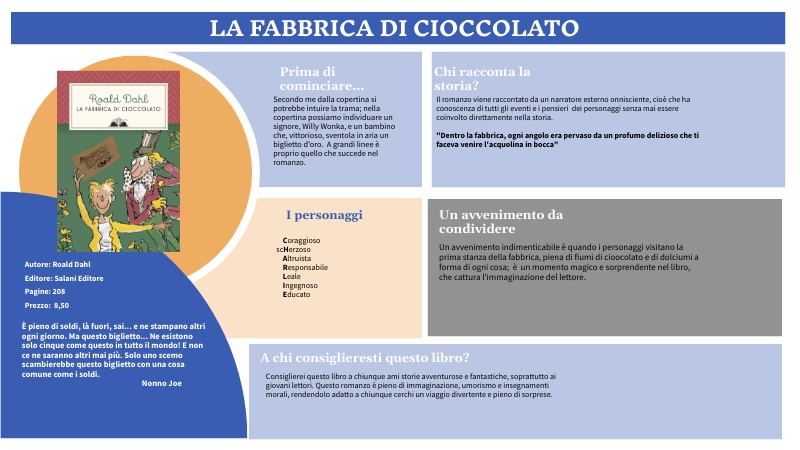 Secondo me dalla copertina si potrebbe intuire la trama; nella copertina possiamo individuare un signore, Willy Wonka, e un bambino che, vittorioso, sventola in aria un biglietto d'oro. A grandi linee è proprio quello che succede nel romanzo.