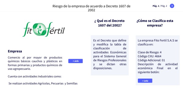 La empresa Fito Fertil S.A.S se clasifica en: Clase de Riesgo: 4 Código CIIU: 4664 Código Adicional: 01 Descripción de actividad económica Final en el siguiente botón: