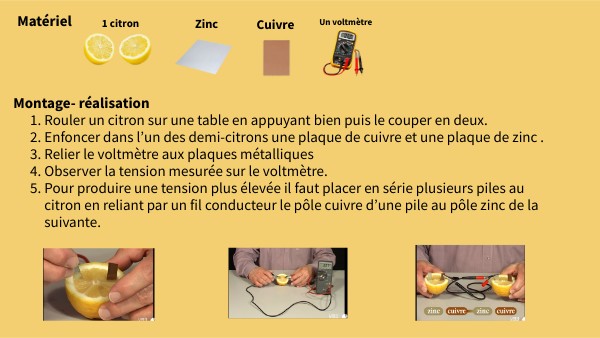 Pour produire une tension plus élevée il faut placer en série plusieurs piles au citron en reliant par un fil conducteur le pôle cuivre d’une pile au pôle zinc de la suivante.