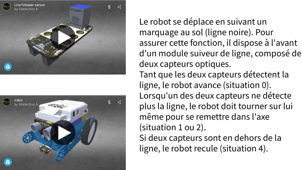 Le robot se déplace en suivant un marquage au sol (ligne noire). Pour assurer cette fonction, il dispose à l'avant d'un module suiveur de ligne, composé de deux capteurs optiques. Tant que les deux capteurs détectent la ligne, le robot avance (situation 0). Lorsqu'un des deux capteurs ne détecte plus la ligne, le robot doit tourner sur lui même pour se remettre dans l'axe (situation 1 ou 2). Si deux capteurs sont en dehors de la ligne, le robot recule (situation 4).