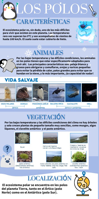 Por las bajas temperaturas y las difíciles condiciones, los animales en los polos tienen que estar específicamente adaptados para vivir ahí. Las principales características son: pelaje blanco y grueso para abrigarse y camuflarse, orejas y narices pequeñas para evitar la pérdida de calor, patas grandes para evitar que se hundan en la nieve, y lo más importante, ¡la capacidad de nadar!