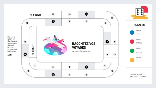 Choose a token, roll the dice and try to reach the goal before anyone else. Good luck!