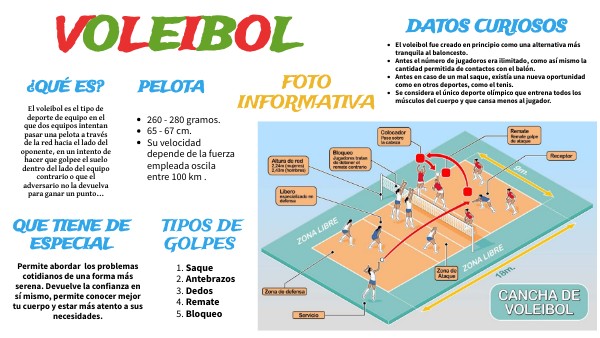 El voleibol es el tipo de deporte de equipo en el que dos equipos intentan pasar una pelota a través de la red hacia el lado del oponente, en un intento de hacer que golpee el suelo dentro del lado del equipo contrario o que el adversario no la devuelva para ganar un punto...