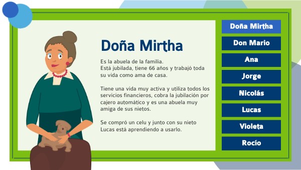 Es la abuela de la familia. Está jubilada, tiene 66 años y trabajó toda su vida como ama de casa. Tiene una vida muy activa y utiliza todos los servicios financieros, cobra la jubilación por cajero automático y es una abuela muy amiga de sus nietos. Se compró un celu y junto con su nieto Lucas está aprendiendo a usarlo.