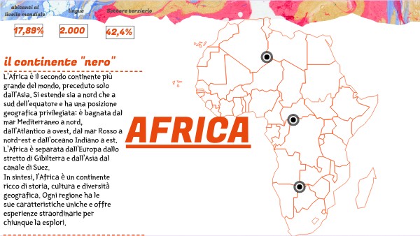 L’Africa è un continente vibrante e variegato, dove le persone vivono in grandi città, villaggi rurali e paesaggi selvaggi. Le lingue, le tradizioni e le storie si intrecciano in un mosaico di culture. Dai deserti del Sahara alle foreste pluviali, l’Africa è un luogo di avventure, sfide e speranze. La popolazione attuale dell’Africa è di circa 1,46 miliardi di abitanti1. Questo significa che quasi 1 persona su 5 nel mondo vive qui. La popolazione africana è giovane: l’età mediana è di 18,8 anni. Molti vivono nelle città, ma ci sono anche molte persone che abitano nelle zone rurali e lavorano nei campi per coltivare cibo come mais, manioca e frutta tropicale. L’Africa è attraversata dall’equatore e dai tropici del Cancro e del Capricorno. Questa posizione geografica crea una grande varietà di climi e ambienti, come deserti, savane e foreste pluviali. Insieme all’Eurasia, forma il cosiddetto Continente Antico. La popolazione africana è composta da una miriade di gruppi etnici, lingue e religioni. Ogni regione ha le sue tradizioni e modi di vivere. Dall’Egitto al Sudafrica, dall’Algeria al Kenya, l’Africa è un crogiolo di culture e identità. In sintesi, l’Africa è un luogo pieno di vita e diversità, con tante persone che contribuiscono alla sua ricchezza culturale e alla sua crescita.