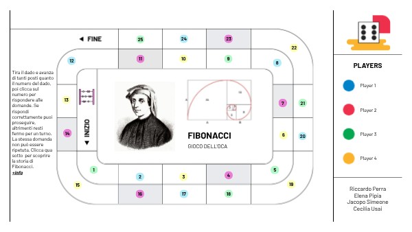 Tira il dado e avanza di tanti posti quanto il numero del dado, poi clicca sul numero per rispondere alle domande. Se rispondi correttamente puoi proseguire, altrimenti resti fermo per un turno. La stessa domanda non può essere ripetuta. Clicca qua sotto per scoprire la storia di Fibonacci.