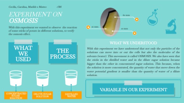1) We peeled one potato and then we cut it into 6 sticks of the same size with a knife;2) we prepared three different solution: we put in the bakers the same quantity of water and then we have added in 2 bakers different quantities of sugar. In one some spoon and in the other one only some granules;3) we put the sticks at the same time in the bakers (2 sticks in 1 bakers)4) we have started wait, and during the hours we have taken some photo;5) after 6 hours we have taken off the sticks from the solutions and we have measured the new lenghts