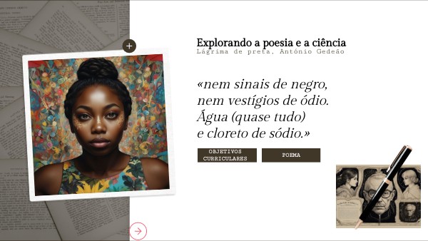 Objetivos: Compreender o poema "Lágrima de Preta" de António Gedeão. Explorar a conexão entre poesia e ciência. Integrar conceitos de Físico-química relacionados com o tema do poema.