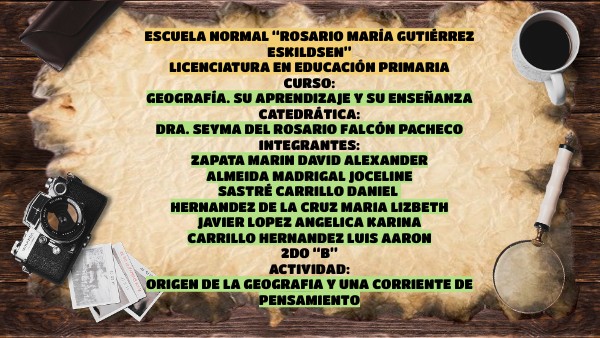 ESCUELA NORMAL “ROSARIO MARÍA GUTIÉRREZ ESKILDSEN” LICENCIATURA EN EDUCACIÓN PRIMARIA CURSO: GEOGRAFÍA. SU APRENDIZAJE Y SU ENSEÑANZA CATEDRÁTICA: DRA. SEYMA DEL ROSARIO FALCÓN PACHECO INTEGRANTES: ZAPATA MARIN DAVID ALEXANDER ALMEIDA MADRIGAL JOCELINE SASTRÉ CARRILLO DANIEL HERNANDEZ DE LA CRUZ MARIA LIZBETH JAVIER LOPEZ ANGELICA KARINA CARRILLO HERNANDEZ LUIS AARON 2DO “B” ACTIVIDAD: ORIGEN DE LA GEOGRAFIA Y UNA CORRIENTE DE PENSAMIENTO