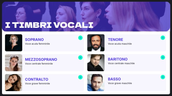 Il coro canta in POLIFONIA, cioè voci diverse cantano parti diverse contemporaneamente.Tradizionalmente le quattro voci che troviamo nel coro sono: Soprano, Contralto, Tenore e Basso.